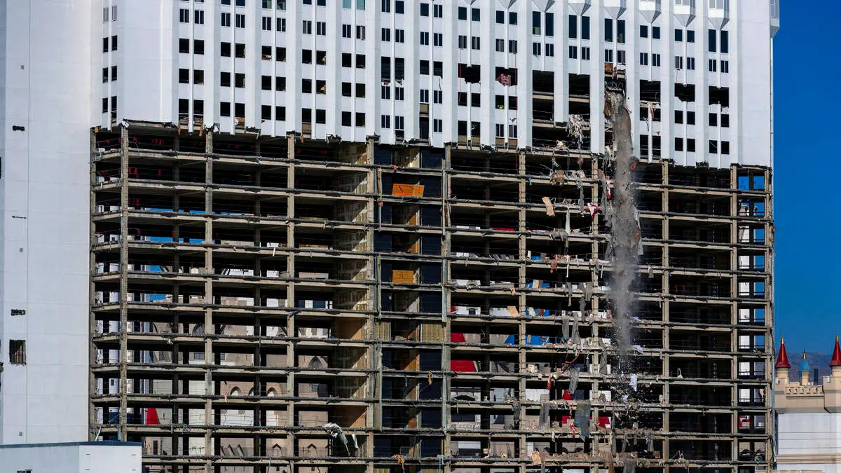 Footage broadcast by CBS News and Global News showed the buildings collapsing in perfect symmetry, a “controlled chaos” that turned into dust clouds rolling over the southern Strip.